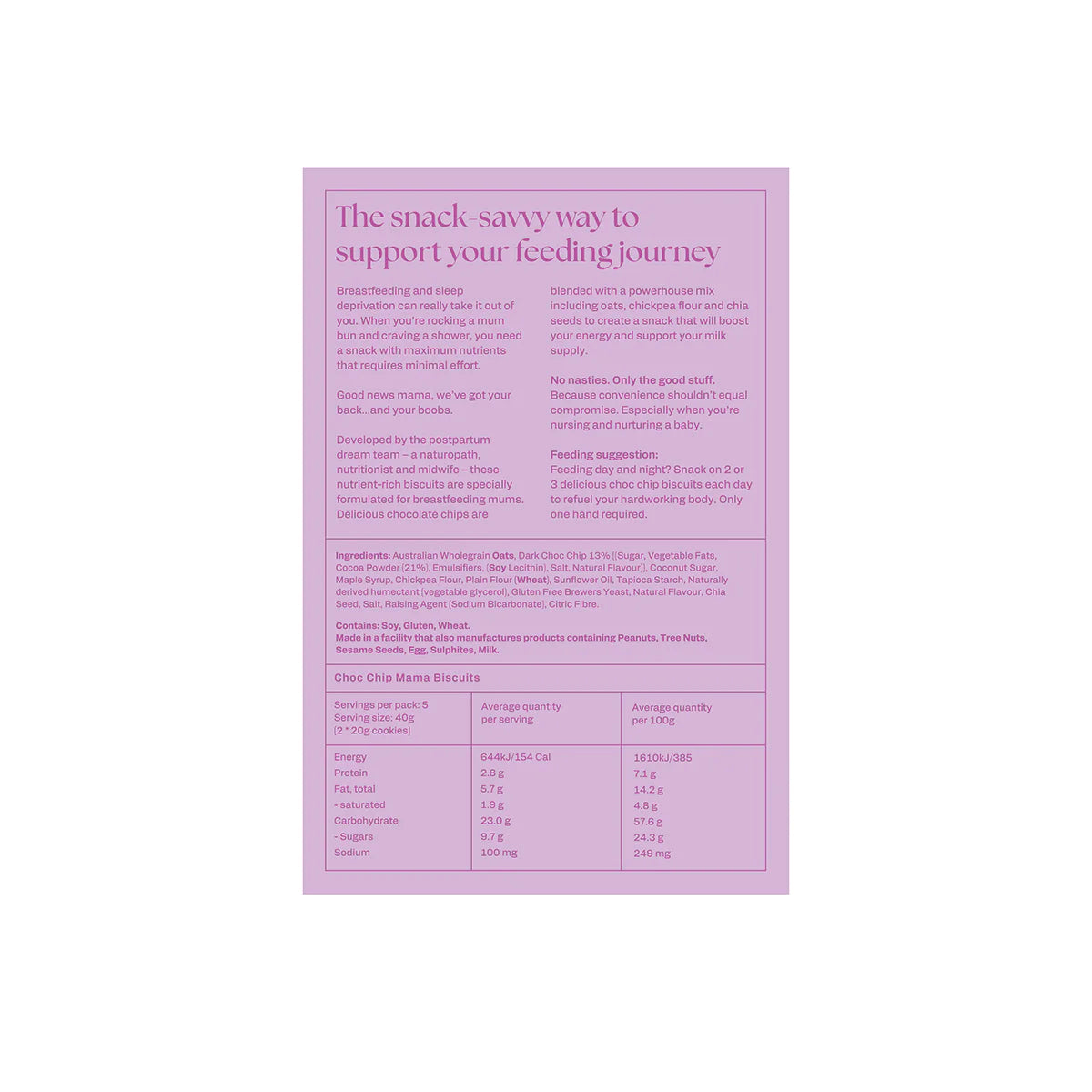 Our best-selling Choc Chip Mama Biscuits are nutrient-rich, specially crafted to help boost and support milk supply for breastfeeding and pumping mums.