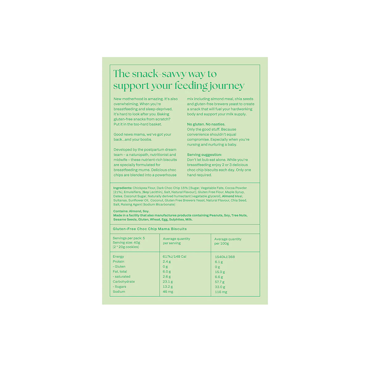 Creamy choc chips are blended into a powerhouse mix including almond meal, chia seeds and gluten-free brewers yeast to create a snack that will fuel your hardworking body and support your milk supply.