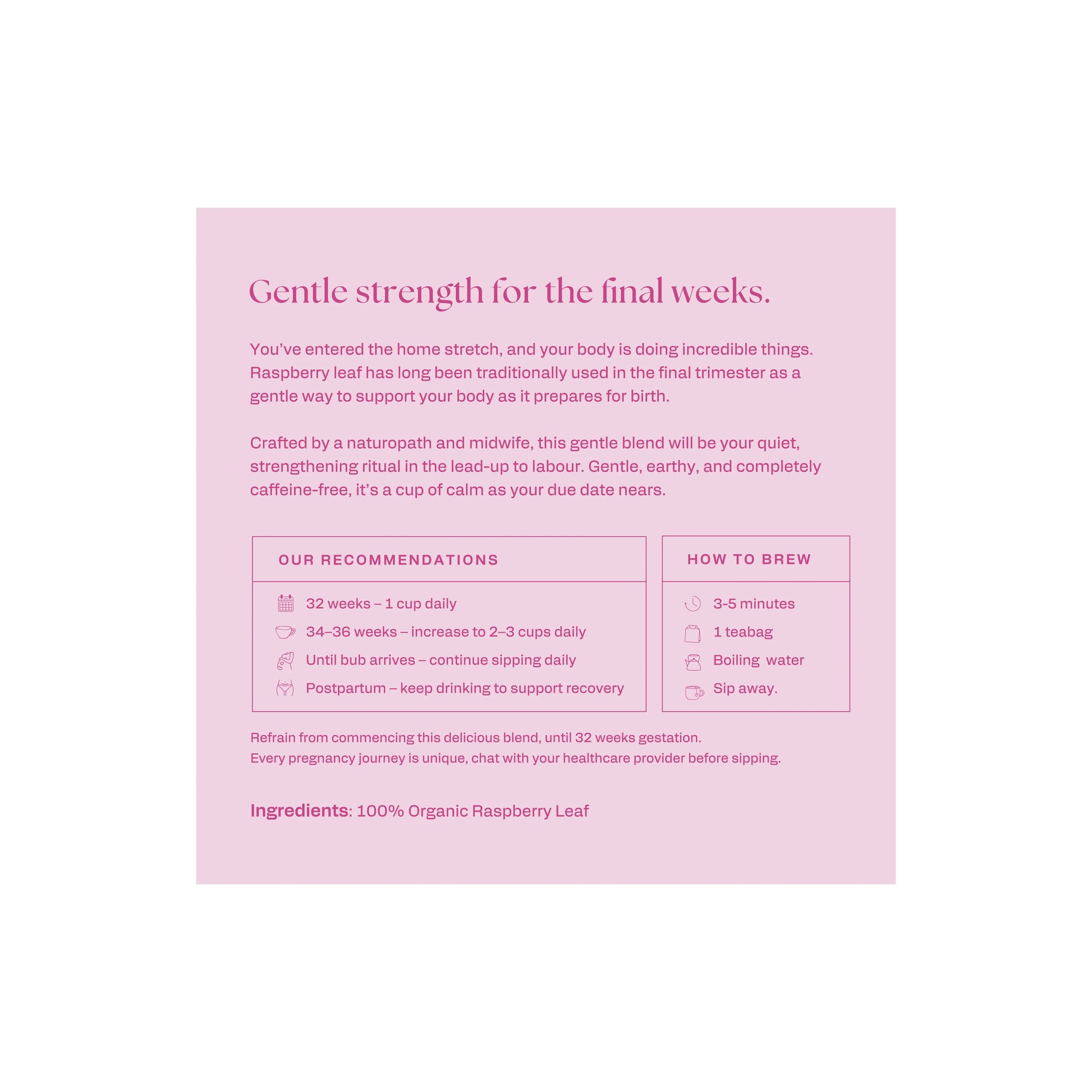 Caffeine free, pregnancy safe, and beautifully grounding, sip from 32 weeks and into postpartum recovery to support your body through the powerful transitions ahead.