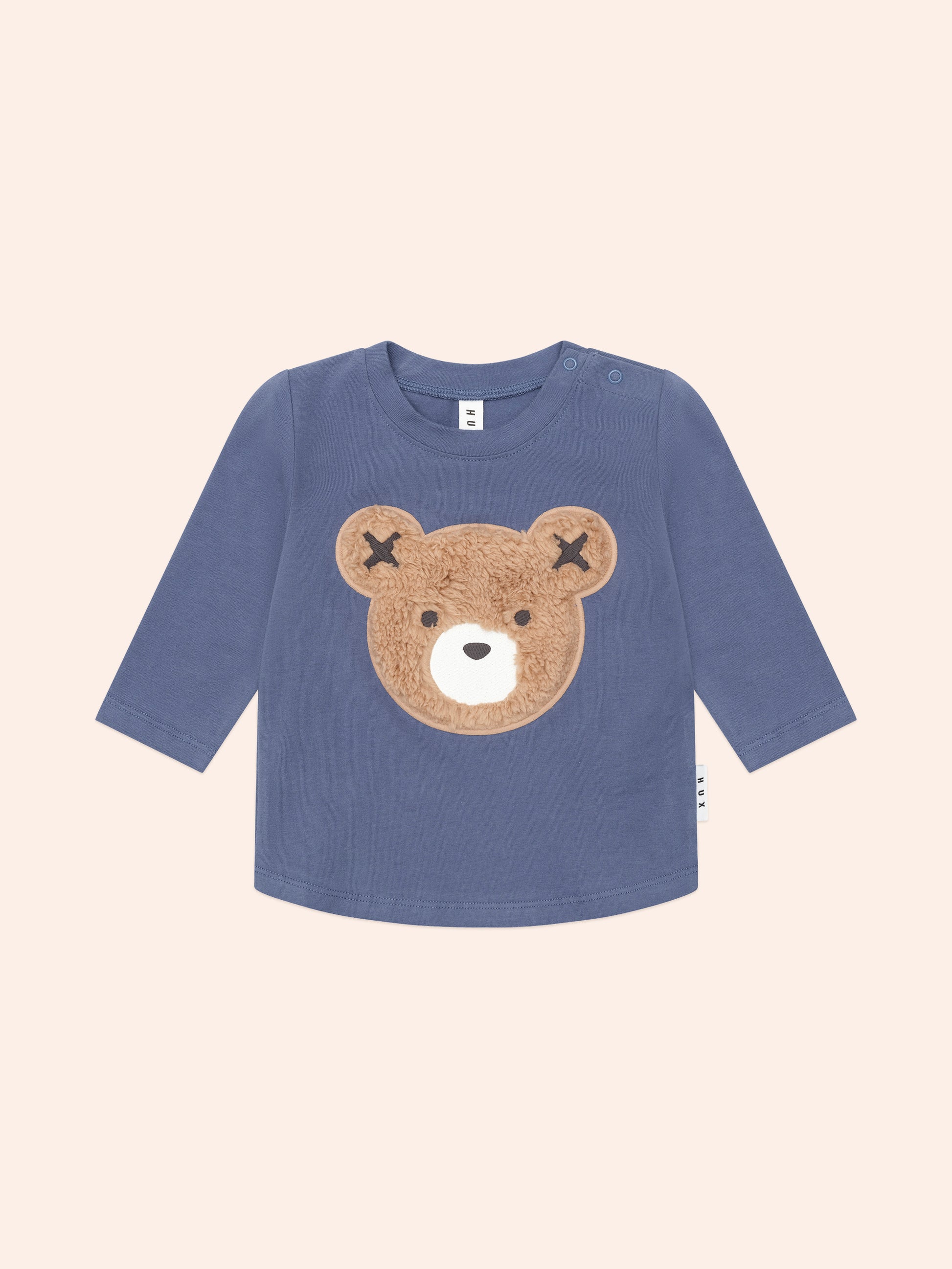 A long-sleeved round neck top in midnight blue. Made from cloud-like organic cotton, it features a tummy-sized Huxbear embroidery in the softest furry fabric. Bound to become their new everyday favourite, baby sizes include stainless steel shoulder snaps for even easier dressing.