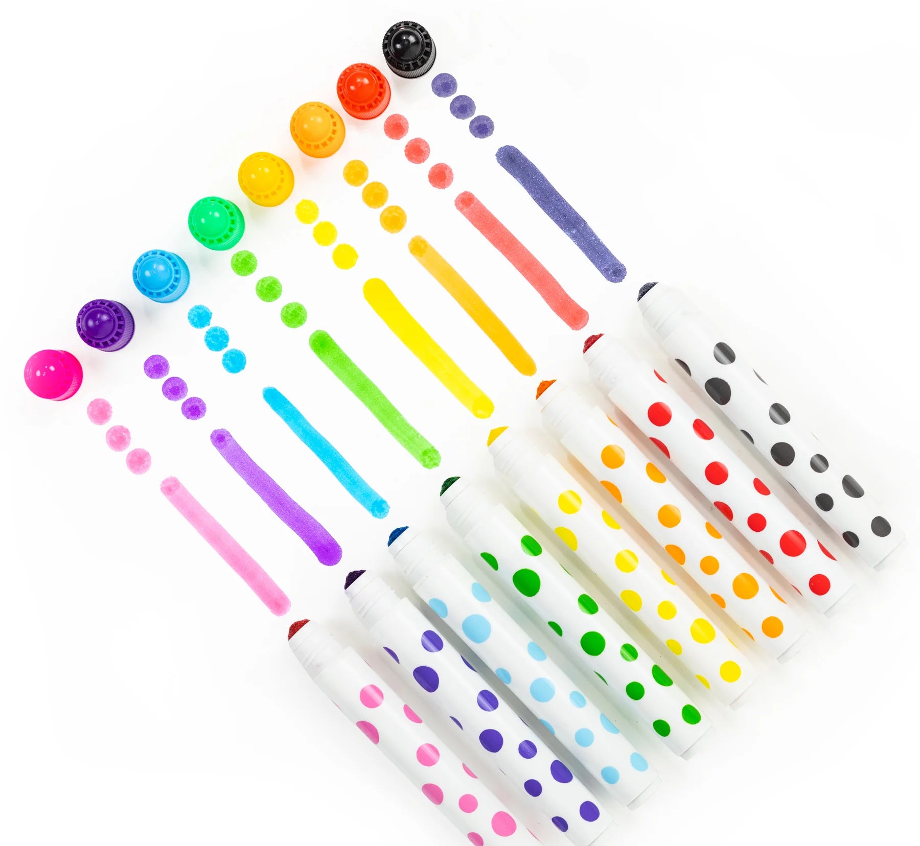 A super fun set of eight high quality, marker-style dot paints. Designed to make painting clean and easy, simply twist off the caps and let the fun begin. No cups or brushes to set up or wash and no drips or spills. Kids will love experimenting with the different effects that can be achieved with the round sponge tip applicator — from fun dotty spots to blending and layering and broad colour sweeps too. The perfect tool for creative art sessions.